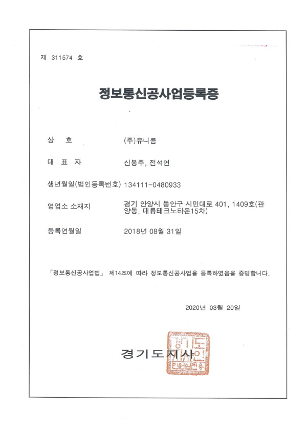 정보통신공사업 등록증 페이지 정보 작성자 (주)유니콤 작성일18-10-01 09:15 조회716회 댓글0건 관련링크 이전글 다음글 목록 본문 정보통신공사업 등록증 이전글 다음글 목록